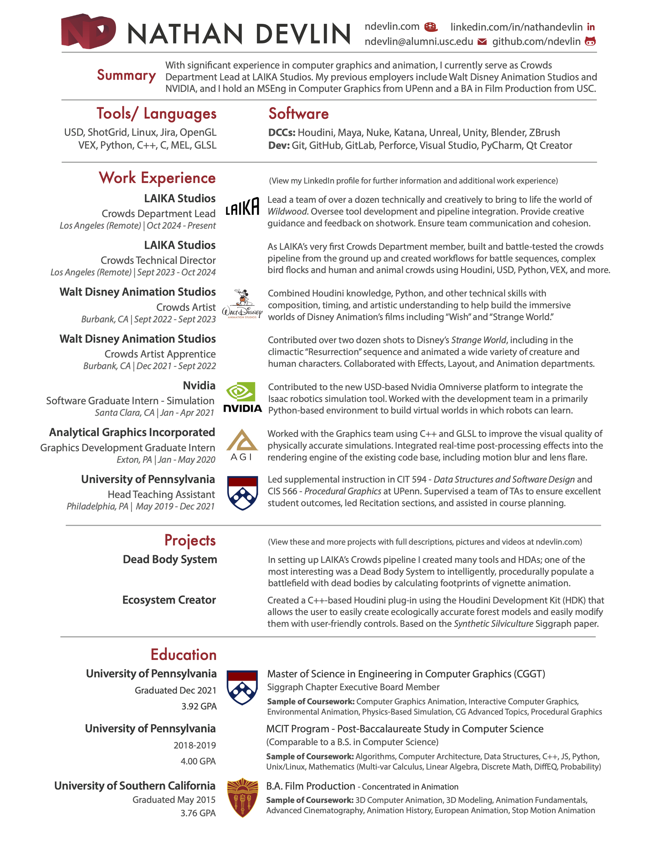 Tools: Universal Scene Description, ShotGrid, Unix/Linux, Git, GitHub, GitLab, Jira, OpenGL, WebGL, Perforce, Motion Builder, Avid MC, Nvidia Omniverse, Adobe CC