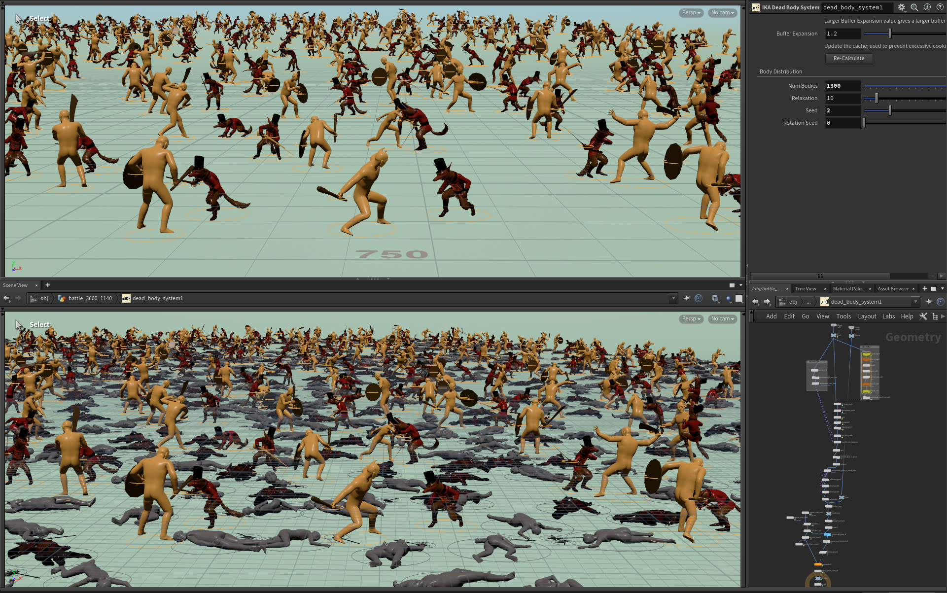 In setting up LAIKA’s Crowds pipeline for Wildwood, in addition to much general pipeline development, I created many tools and HDAs; one of the most interesting was a Dead Body Placement Tool for Battle sequences to intelligently, procedurally populate a battlefield with dead bodies by calculating footprints of vignette animation.